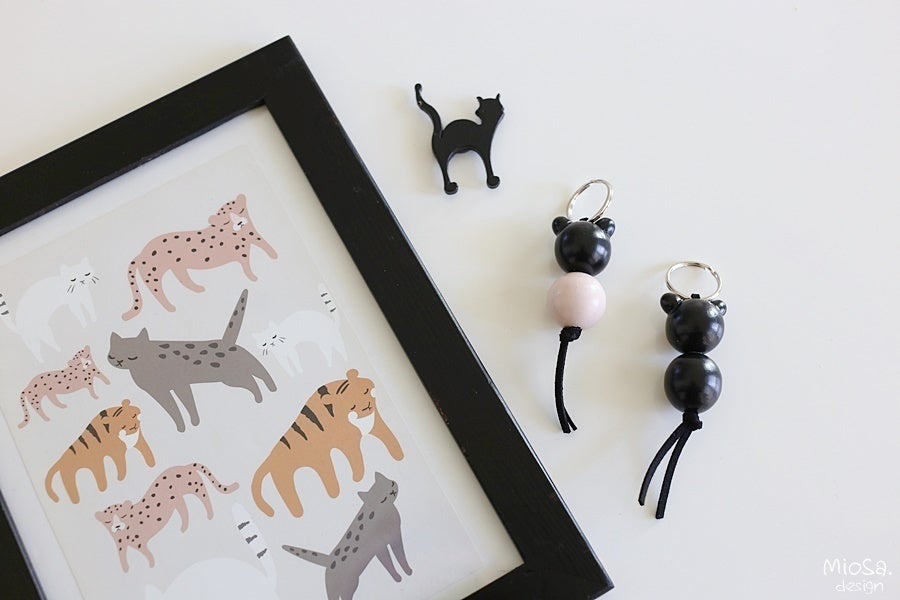 Kissa-avaimenperä muodostuu kahdesta puuhelmestä ja mustasta mokkanauhasta. Alemman puuhelmen sävy on valittavissa valikosta.