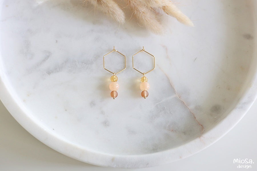 Helmien erilaiset pinnat yhdistettynä samaan korvakoruun luovat korulle upean ja uniikin ilmeen! Nelea on myös hyvin monikäyttöinen, sillä voit käyttää sitä myös ilman helmiä; pelkän kullatun korvakorurenkaan kera!