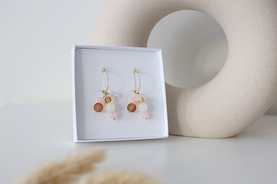 Lara-korvakorut kauniin eri sävyisillä helmillä: ruusukvartsin kaverina valkoista, kirkasta ja ruskean sävyjä.