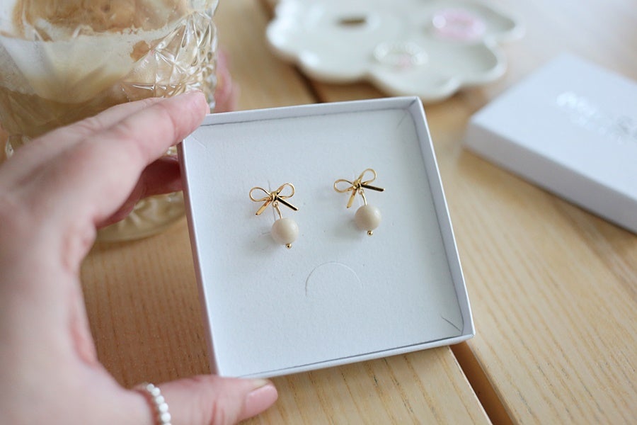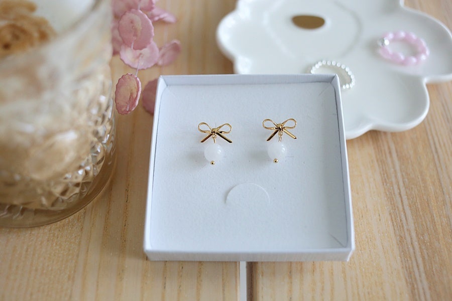 Sarah-korvakorut yhdistävät nappikorviksen ja hennon, roikkuvan korviksen kauniilla tavalla: rusettiosasta roikkuu yksi kaunis luonnonkivihelmi valitsemassasi sävyssä. Täydellinen korvakoru sekä arkeen että juhlaan!